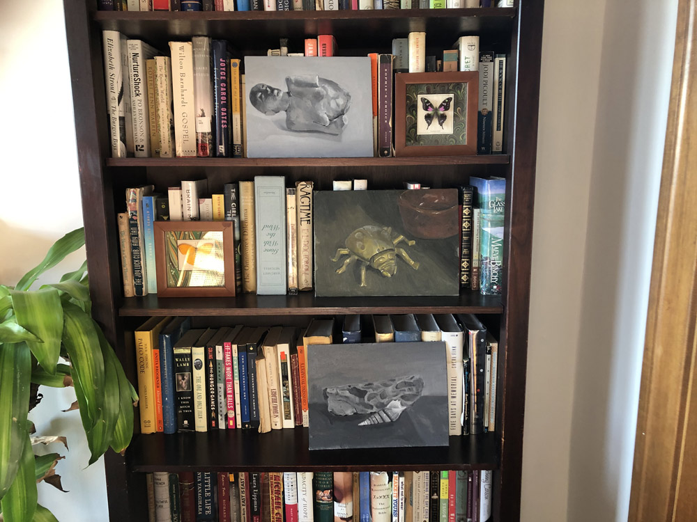 I’m finding as I’m painting on my own that I’m breaking every rule we’re being taught at the school. Fat over lean? Bah! Carefully painting patches of color rather than shapes? Well, that one I should do — but I haven’t been. Shapes all the way. It’s been one thing to follow the correct procedure when I’m painting oven mitts and boxes, but a whole lot more difficult when painting something as complicated as this bug turned out to be. Besides, Carole Marine says she paints her backgrounds last, choosing her order based on the saturation of the colors, so perhaps there are other “correct” procedures as well…. So much to learn!