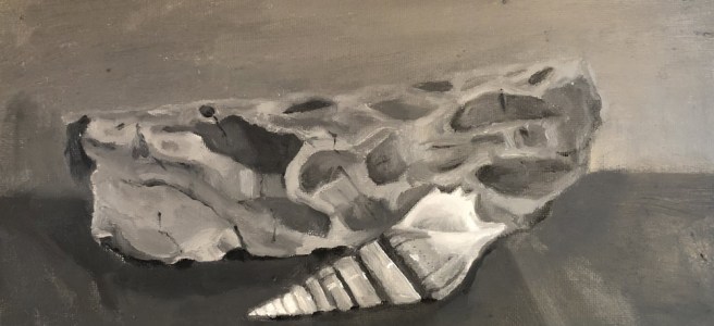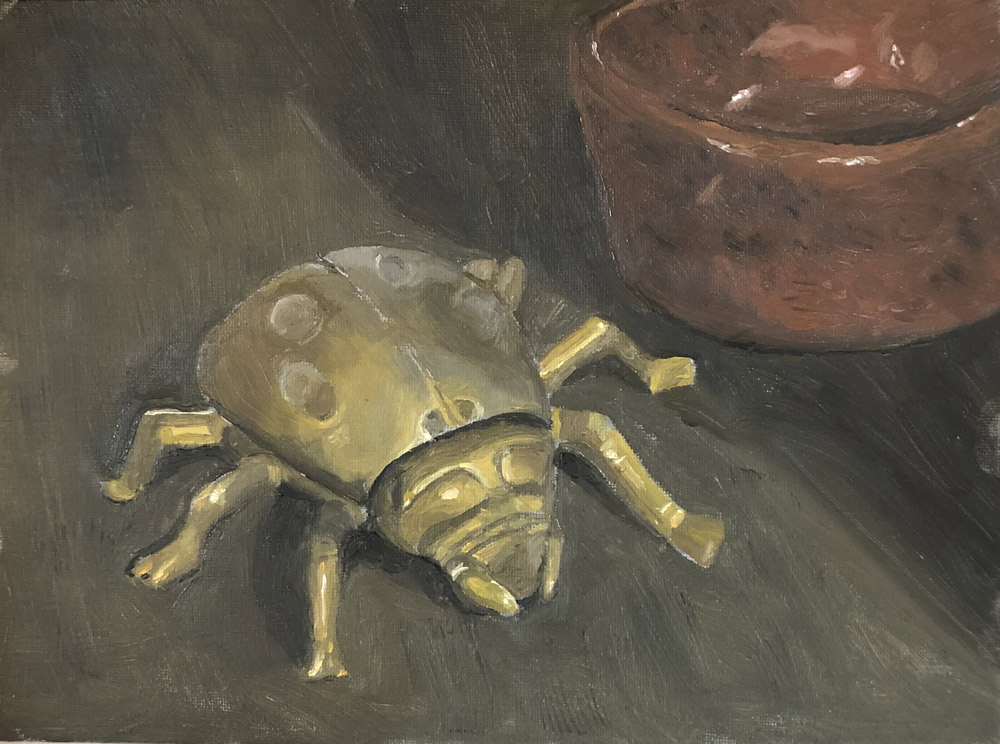 Good Lord but this was tough. There’s a reason, I’m learning, that people start out with less precise objects like apples and pears: Unless your apple is turquoise and shaped like a banana, it’s almost difficult to make an apple look unnatural — there’s so much acceptable variation. Not so with a machine-made, perfectly symmetrical brass ladybug sculpture with legs poking out every which way: You might not have ever seen one before, but you know what it’s supposed to look like. I drew and wiped off three times before I measured my way to a shape that was even remotely reminiscent of my model.