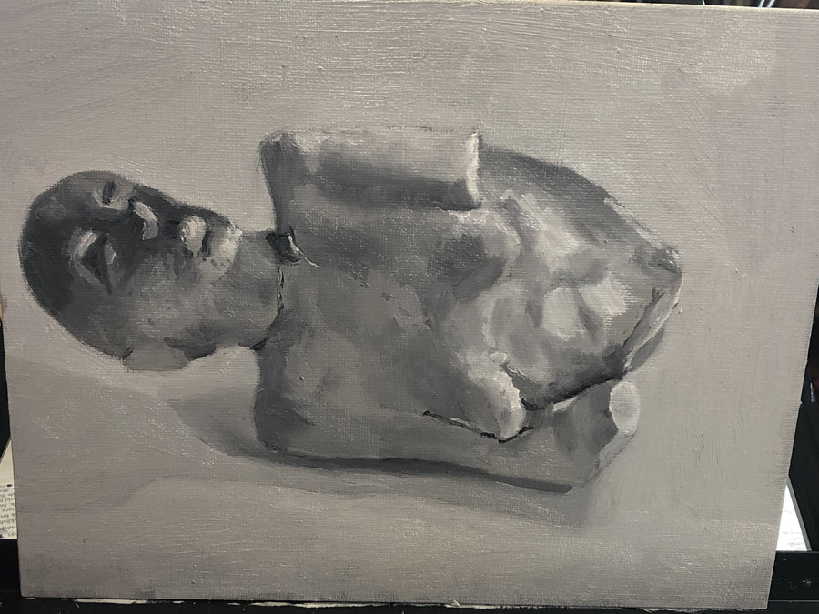 My biggest issue, once again, was light. Not only did the light on my model change throughout my session — making it look entirely different — but I had a bright florescent clamp light pointed directly on my canvas the whole time I was painting. To me, the colors I was using looked vibrant and alive, until I took away the light and…